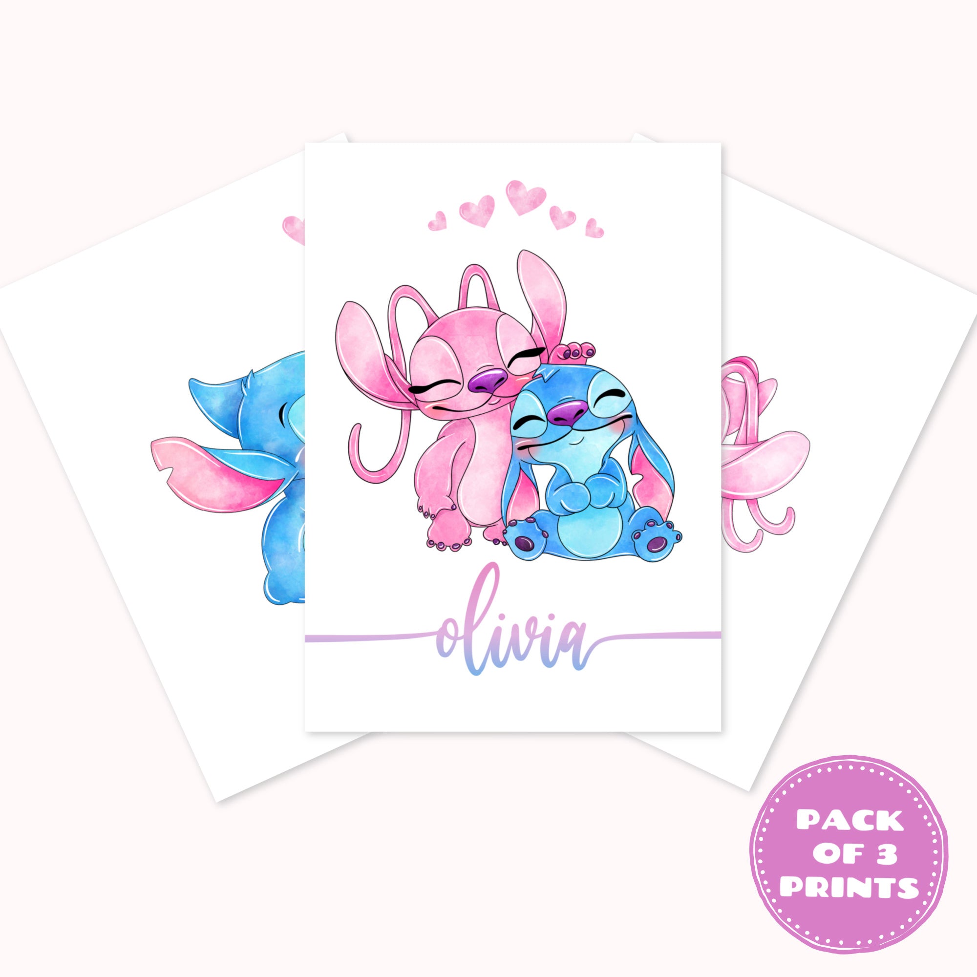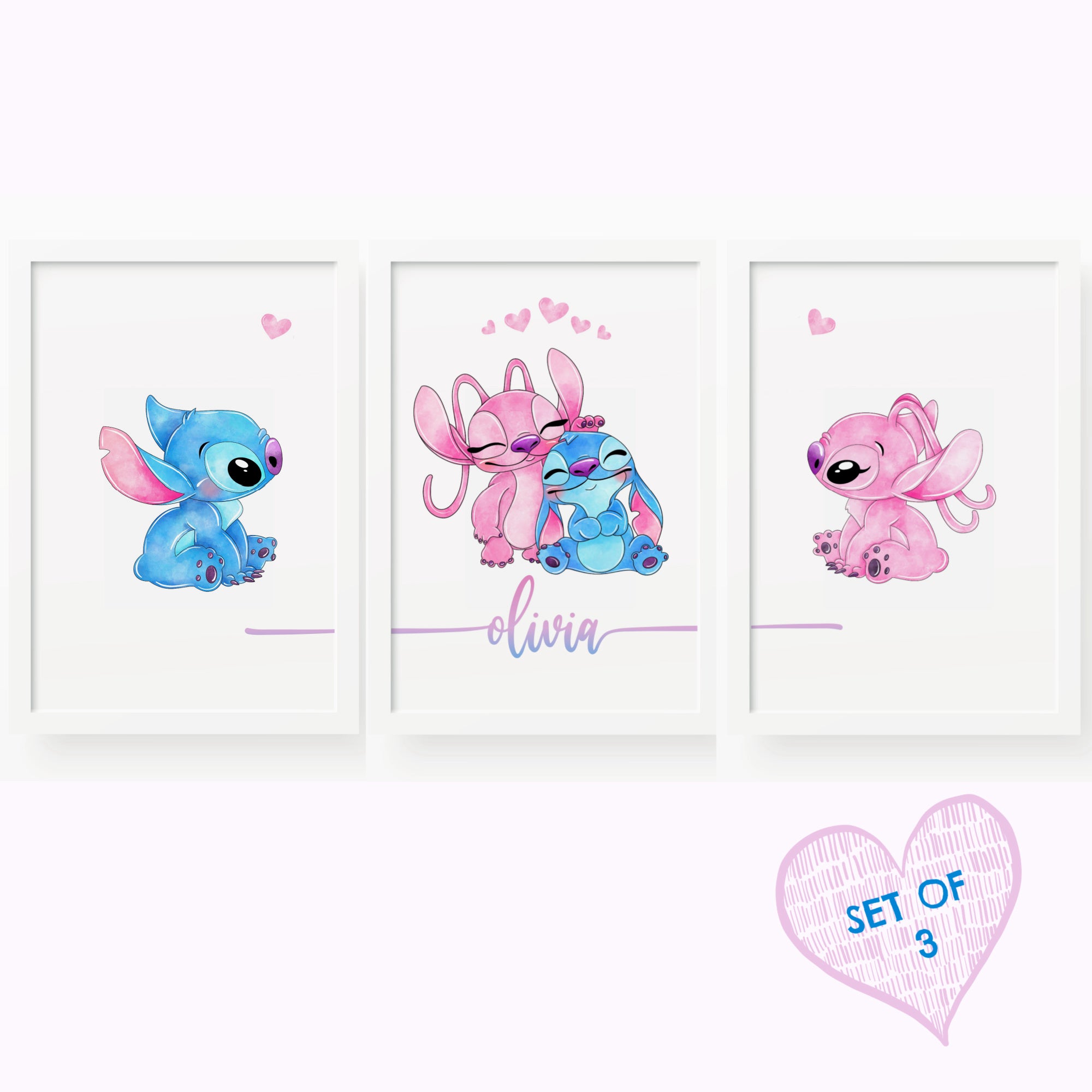 BEAUTIFUL PERSONALISED SET 0F 3 STITCH AND ANGEL PRINTS Personalised with name High quality fine art quality prints